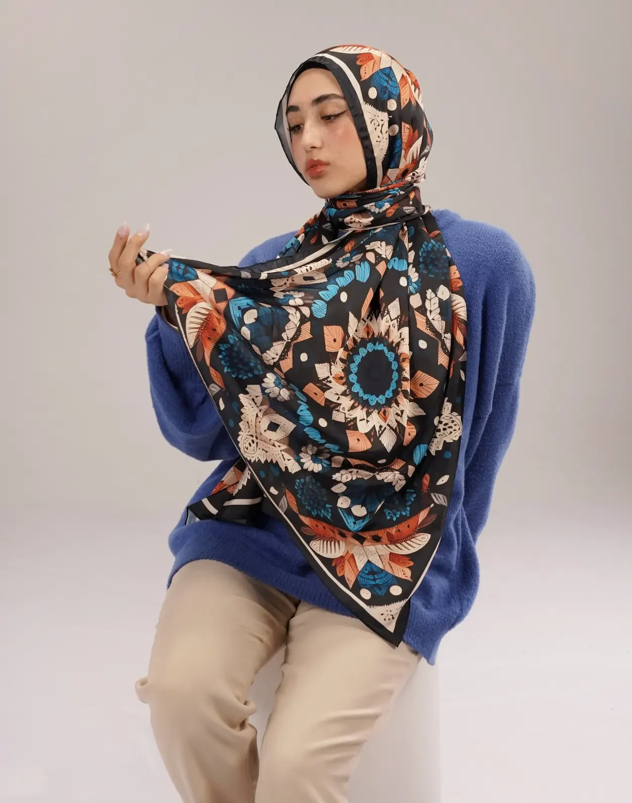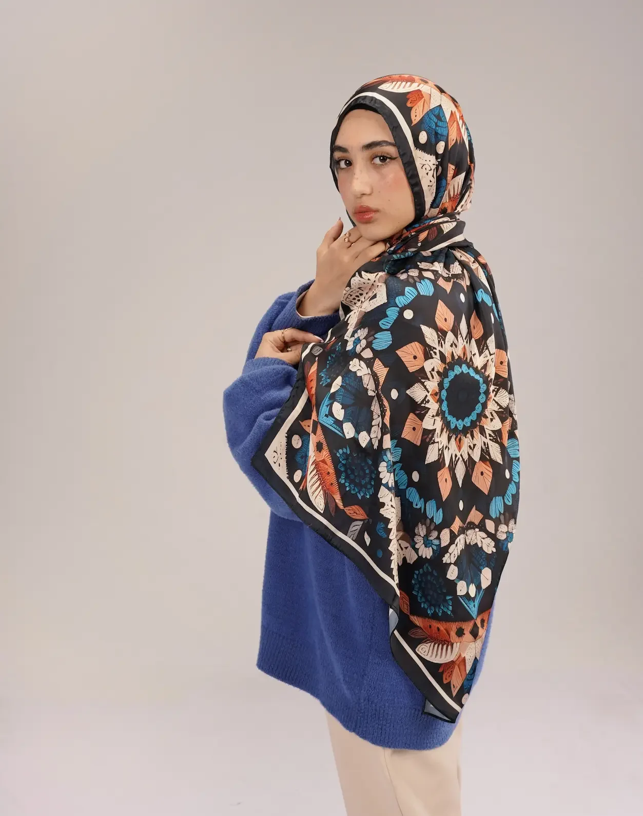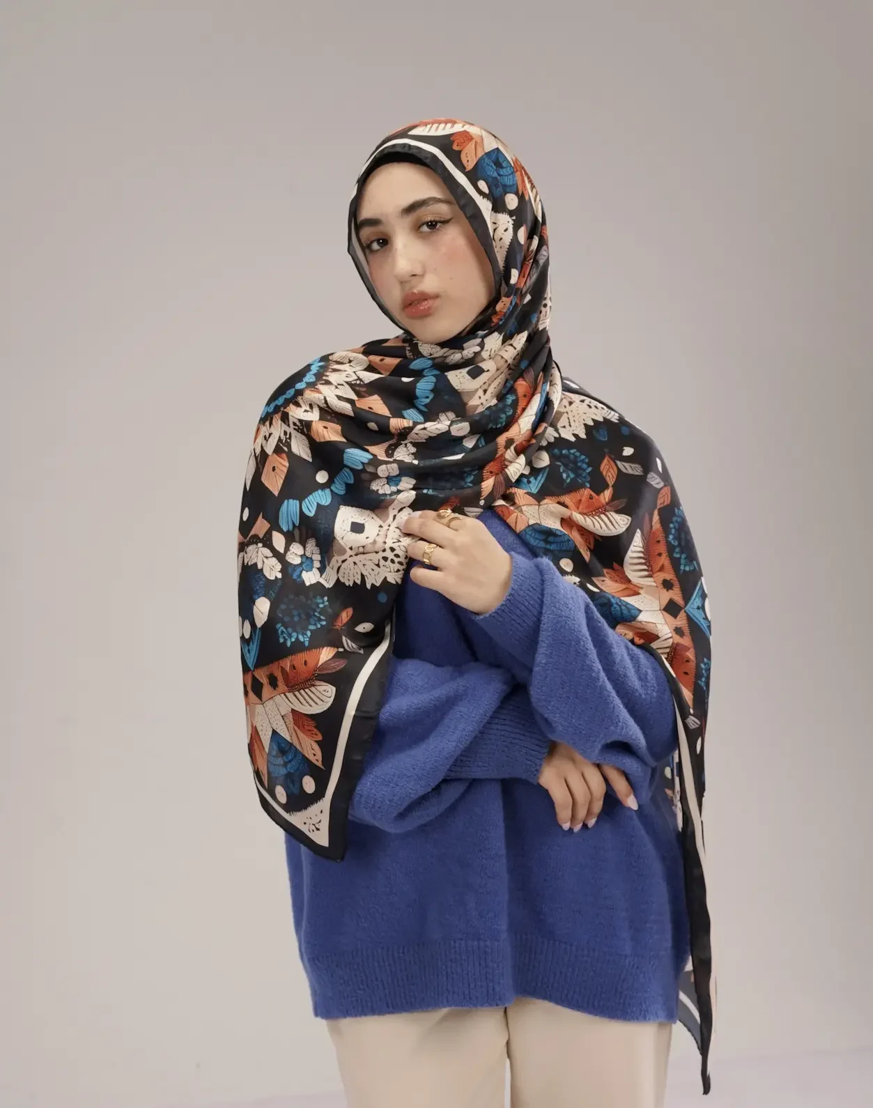 Essence is a celebration of detail and harmony, featuring a bold central motif framed by warm earthy tones and deep blues, crafted on a premium satin hijab for an elegant and luxurious look.