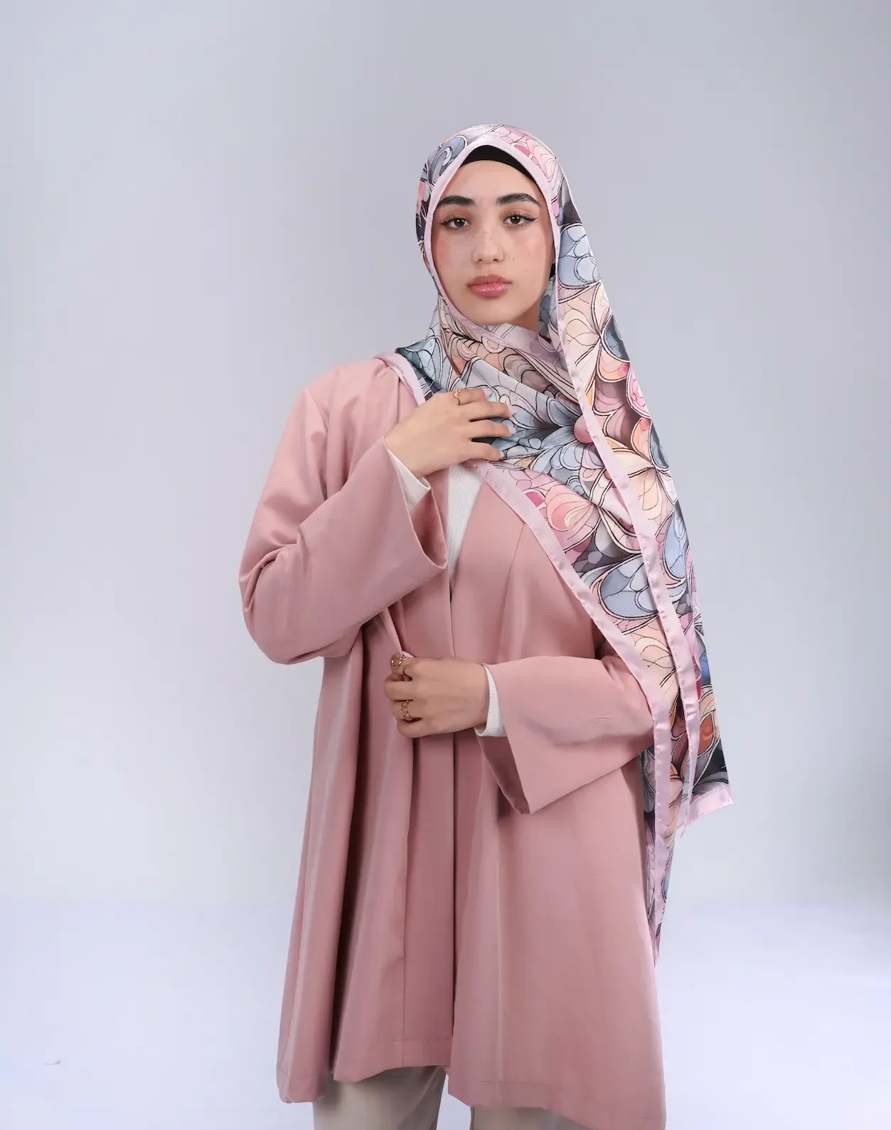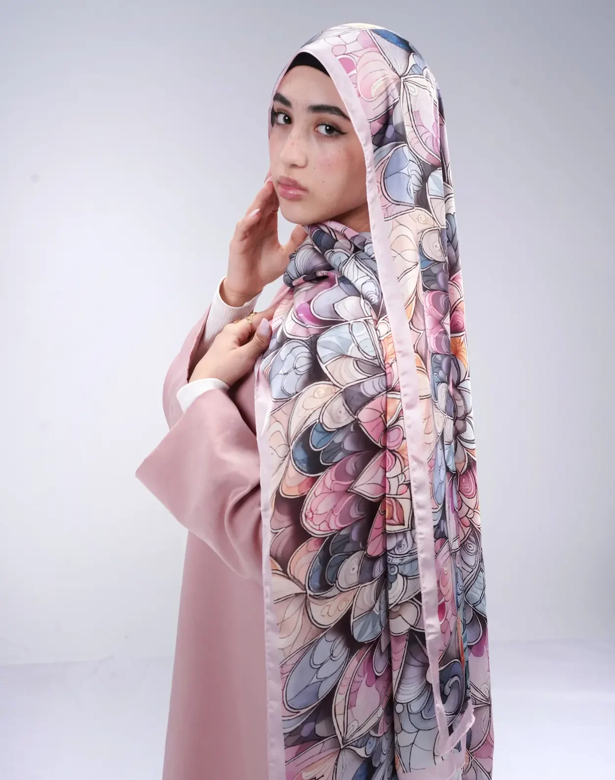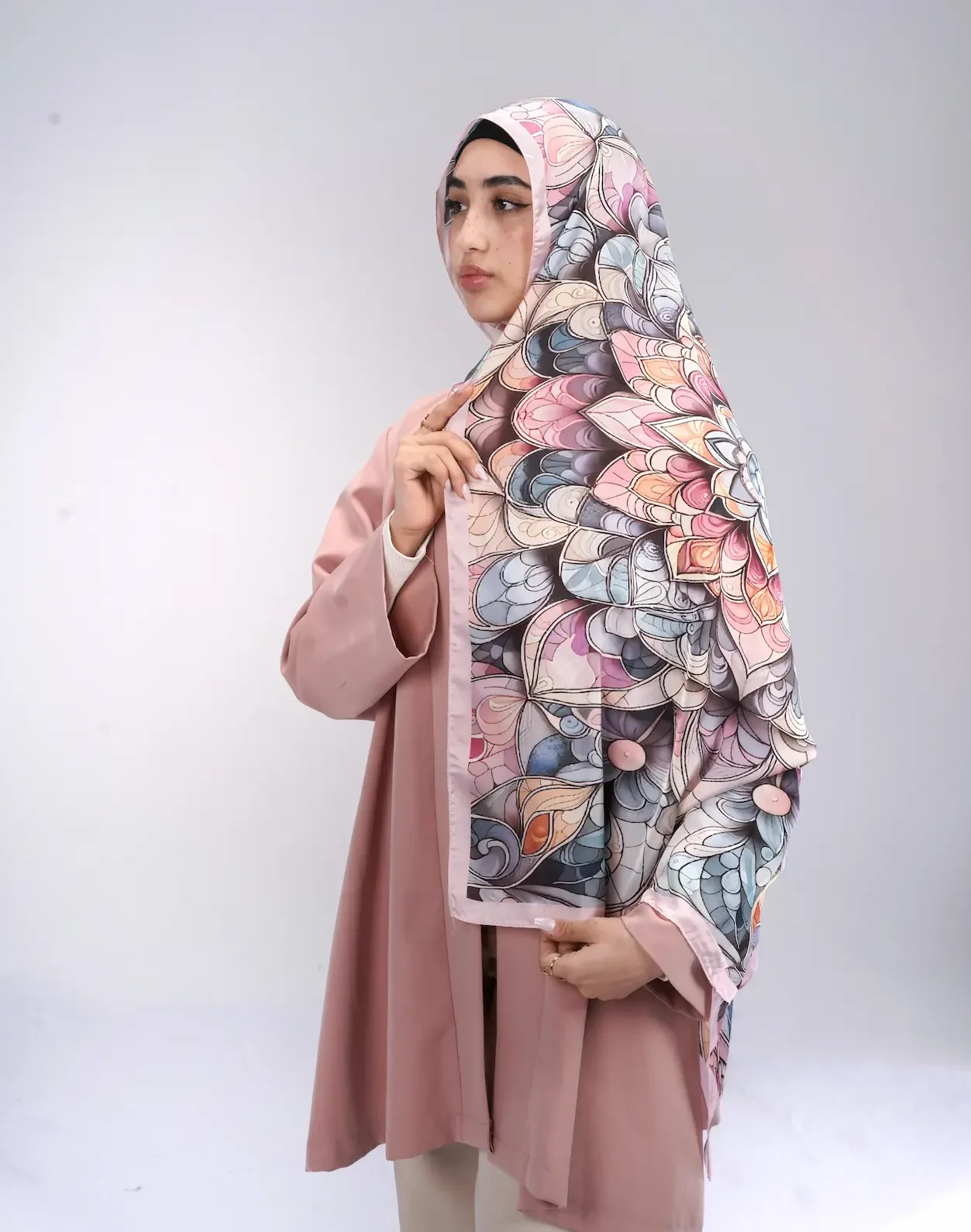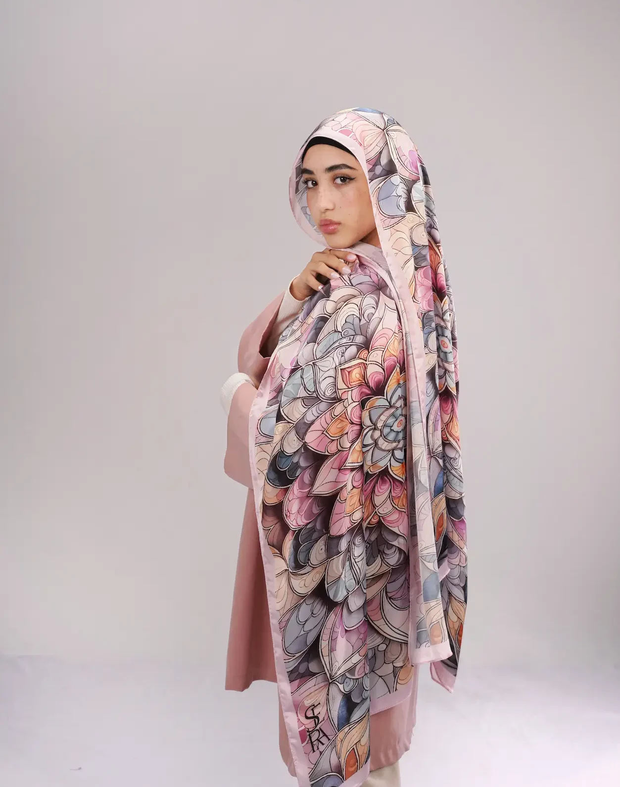 Inspired by the harmony of mandala art, this piece wraps you in refined sophistication. Its layered floral composition and balanced design make it a timeless addition to your wardrobe.